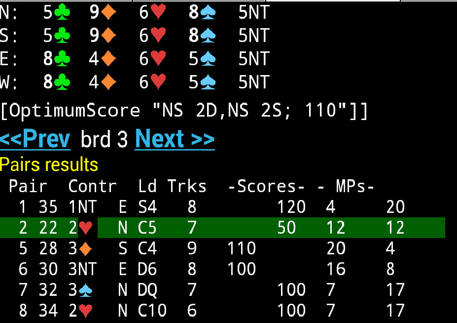 The top section shows the pbn filename and board number, followed by a makeable tricks analysis from your website, if supplied by your club's card dealing system. Then comes individual results by the pair numbers who played the hand. Finally BriJ targets shows BriJ's auto-bid- and-play prediction of a possible result.